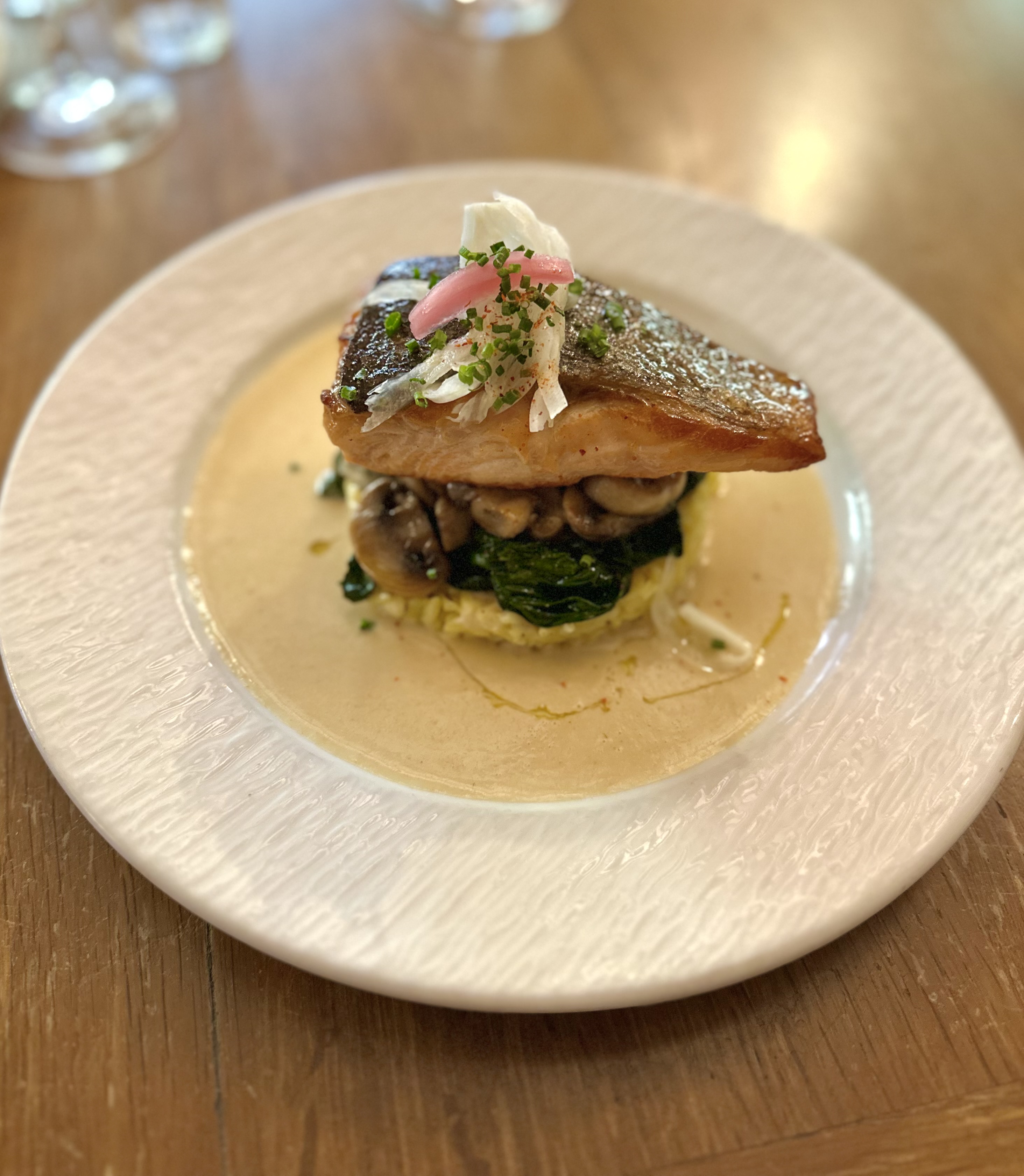 Saumon label rouge, sauce raifort, riz pilaf safrané, tombé d’épinard et champignons