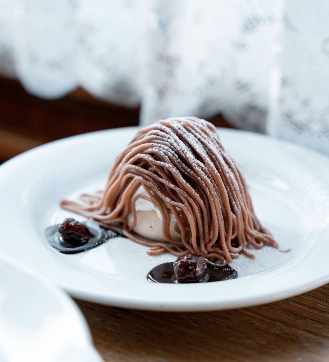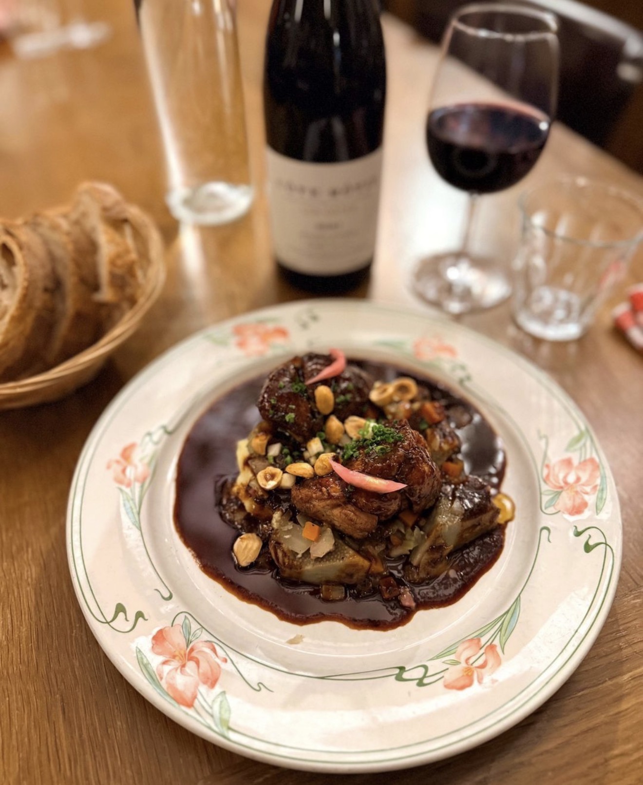 Pintade fermière, sauce moutarde à l’ancienne, chou au lard fumé, marrons et noix
