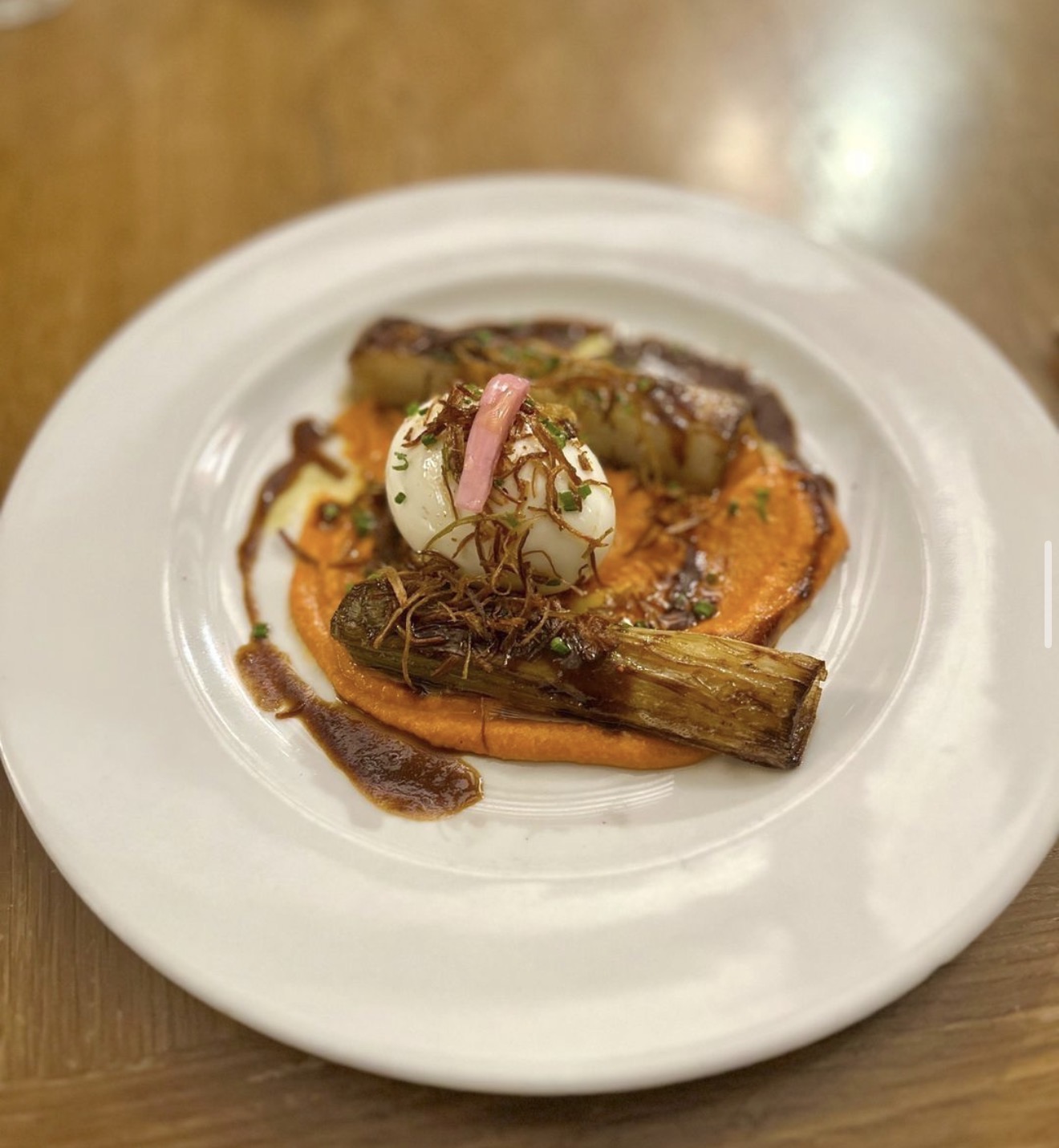 Poireaux grillés, sauce romesco, œuf mollet et jus corsé