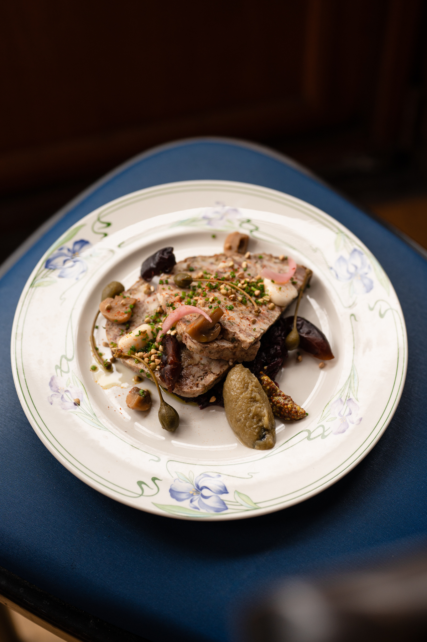 Terrine de queue de boeuf au cornichon est câpre, salade de lentilles à l’estragon